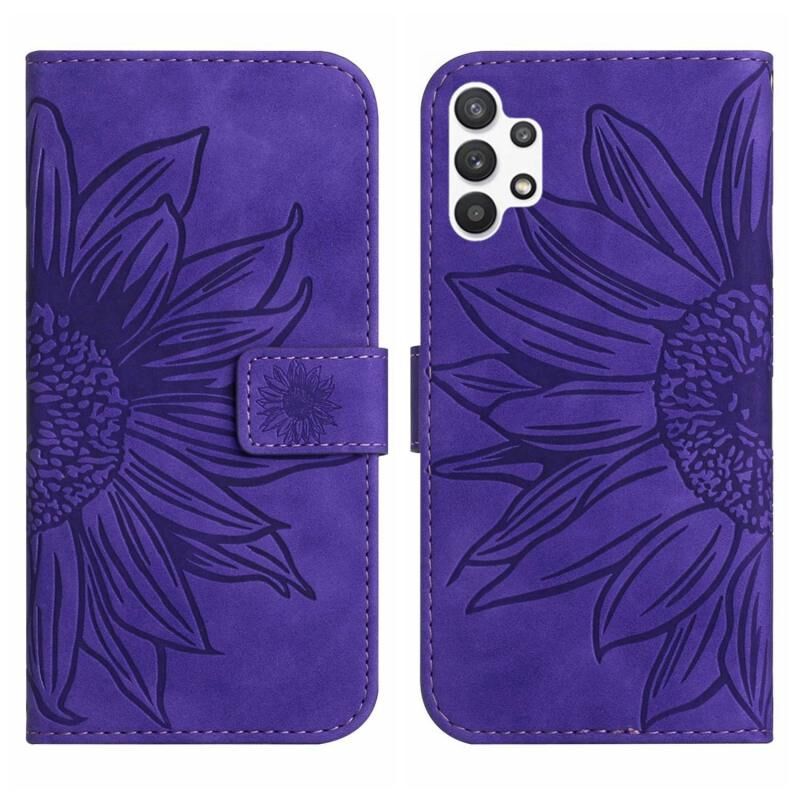 Για το Samsung Galaxy A32 4G δέρμα αίσθηση Sun Flower μοτίβο Flip δέρμα τηλέφωνο υπόθεση με κορδόνι (σκούρο μωβ)