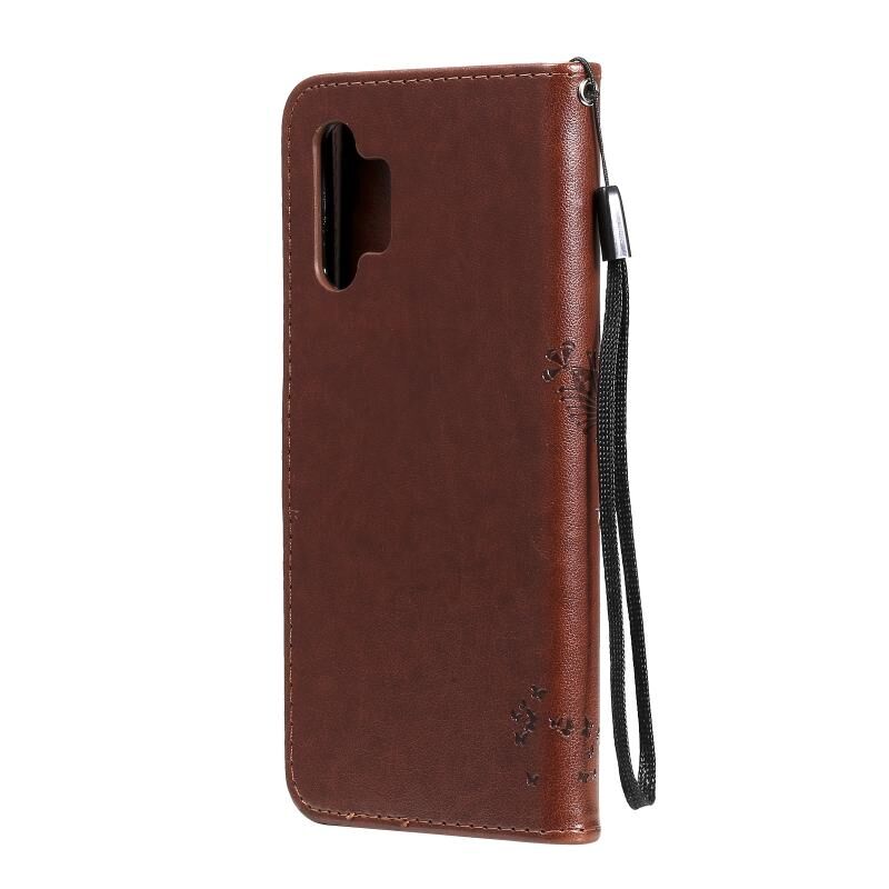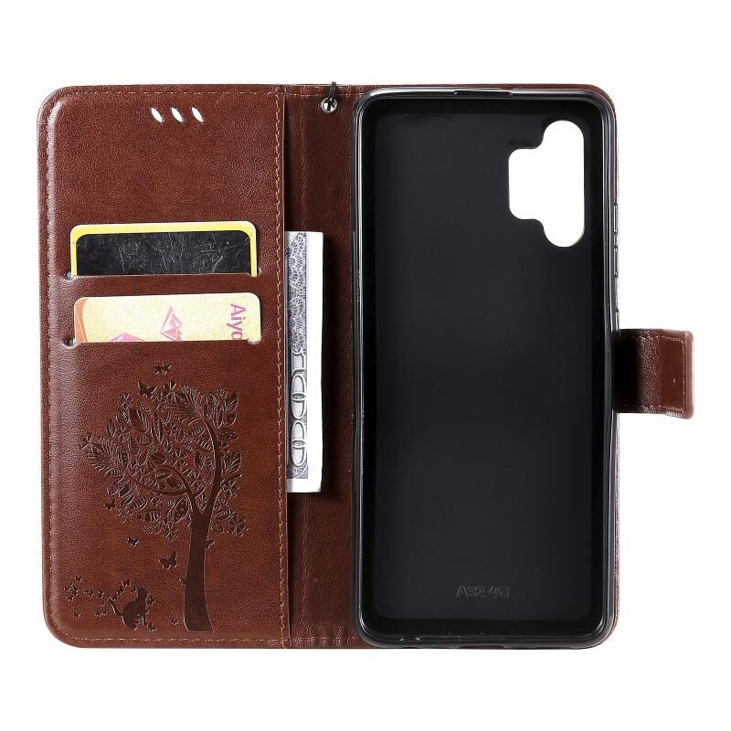 Θήκη Samsung Galaxy A32 4G με σχέδιο Δέντρου & Γάτας, εκτύπωση με θερμοτύπηση, οριζόντια, από δερματίνη PU με βάση στήριξης, θήκες για κάρτες, πορτοφόλι & κορδόνι (Καφέ)