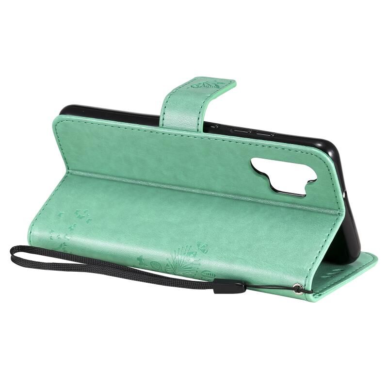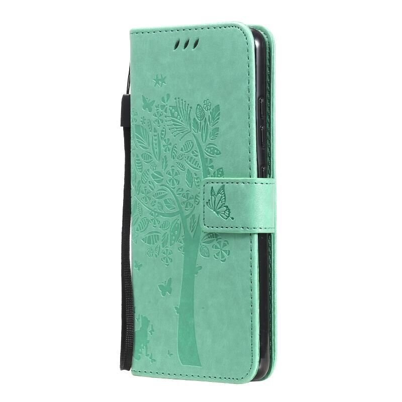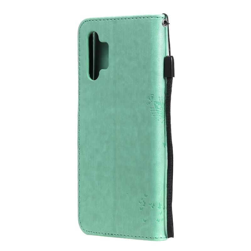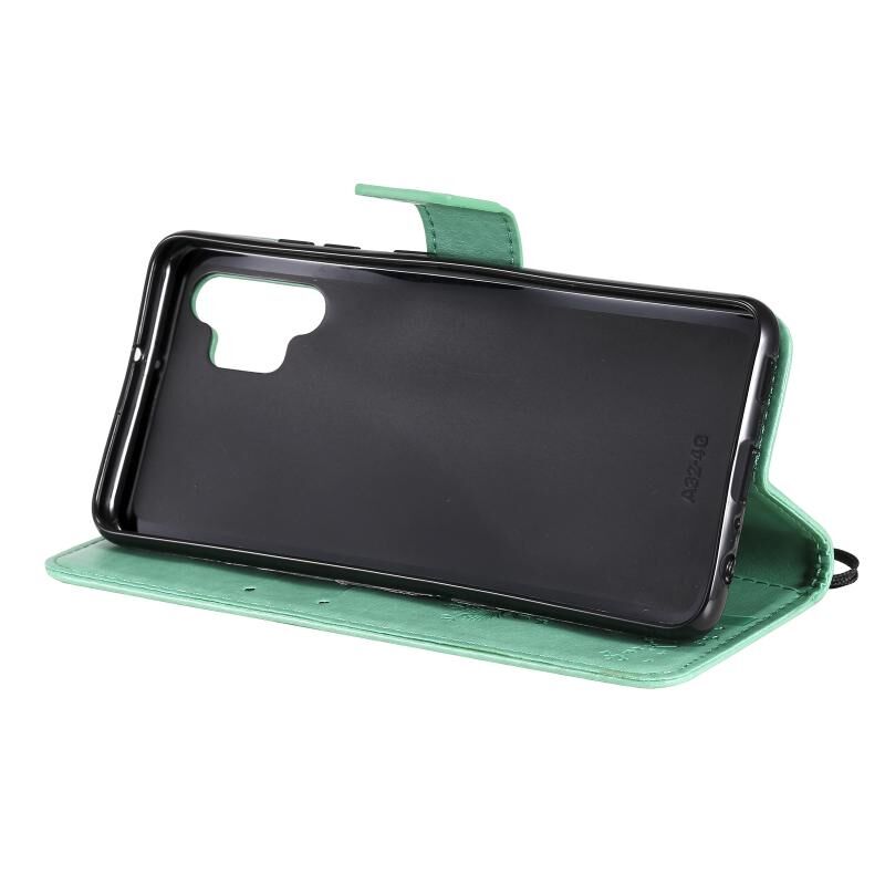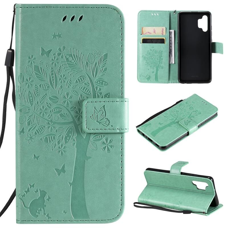 Θήκη Samsung Galaxy A32 4G με σχέδιο Δέντρου & Γάτας, εκτύπωση με θερμοτύπηση, οριζόντια, από δερματίνη PU με βάση στήριξης, θήκες για κάρτες, πορτοφόλι & κορδόνι (Πράσινο)