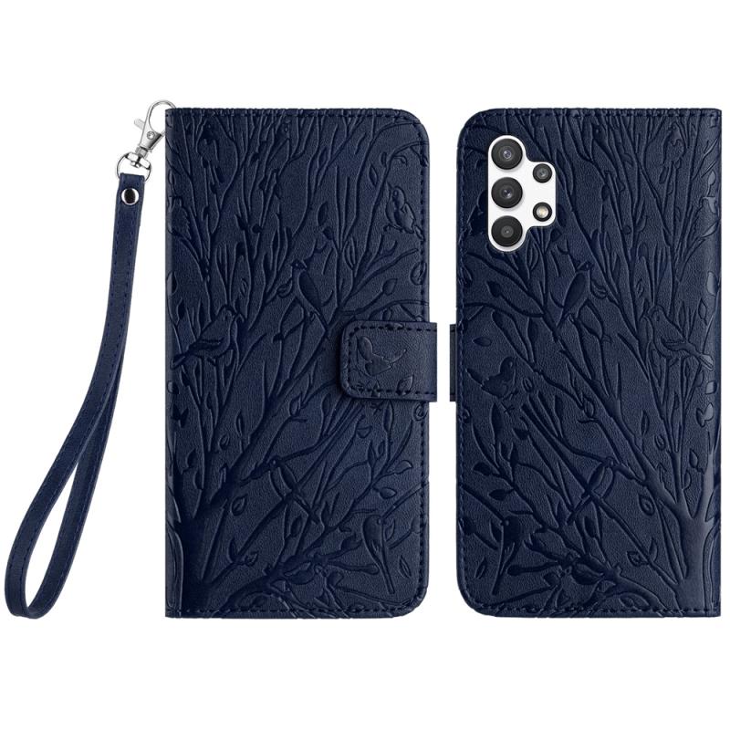 For Samsung Galaxy A32 4G Tree Birds Embossed Pattern Leather Phone Case(Blue)