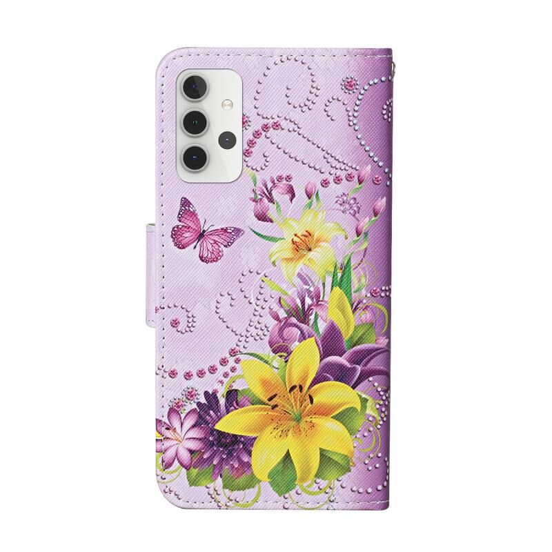 Θήκη Samsung Galaxy A32 5G Δερμάτινη Οριζόντια με σχέδιο ζωγραφικής, χρώμα (Κίτρινο Λουλούδι Πεταλούδα), με βάση, θήκες καρτών, πορτοφόλι & λουρί. (Κίτρινο Πεταλούδα Λουλούδι)