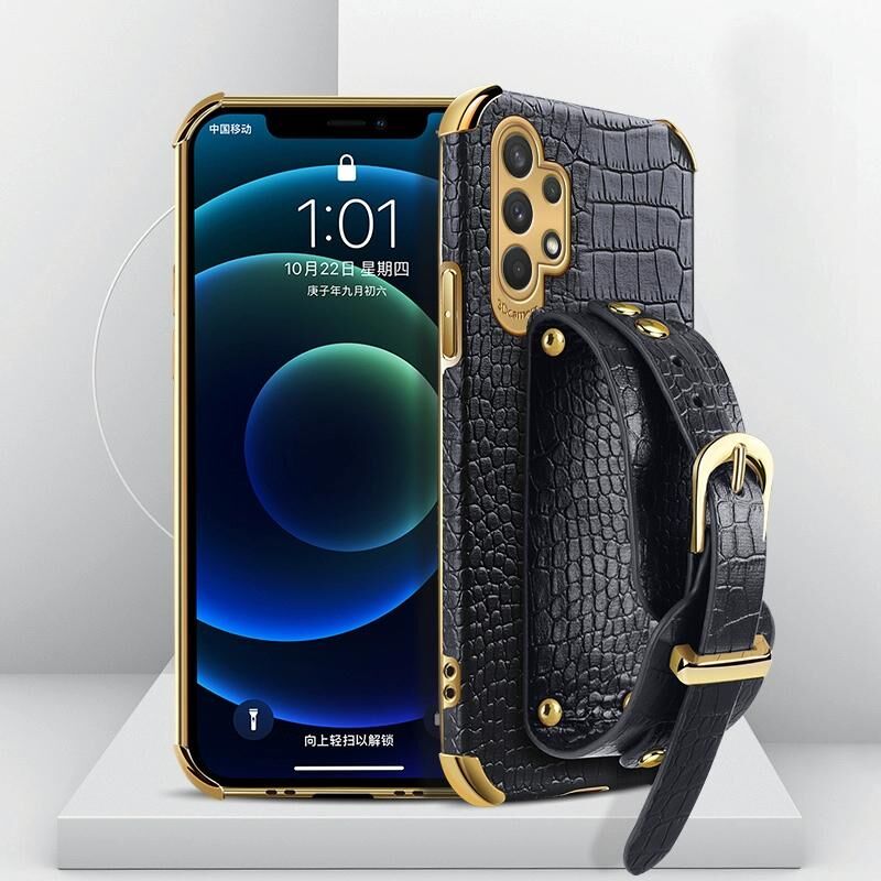 Για Samsung Galaxy A32 5G Electroplated TPU Crocodile Pattern Leather Case με λουράκι καρπού (Μαύρο)