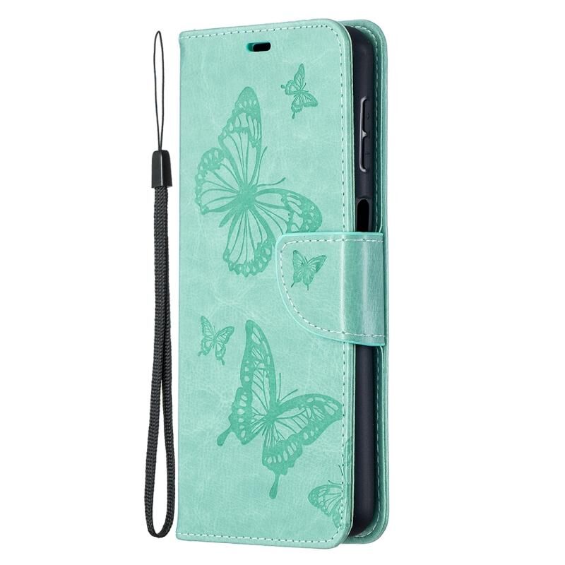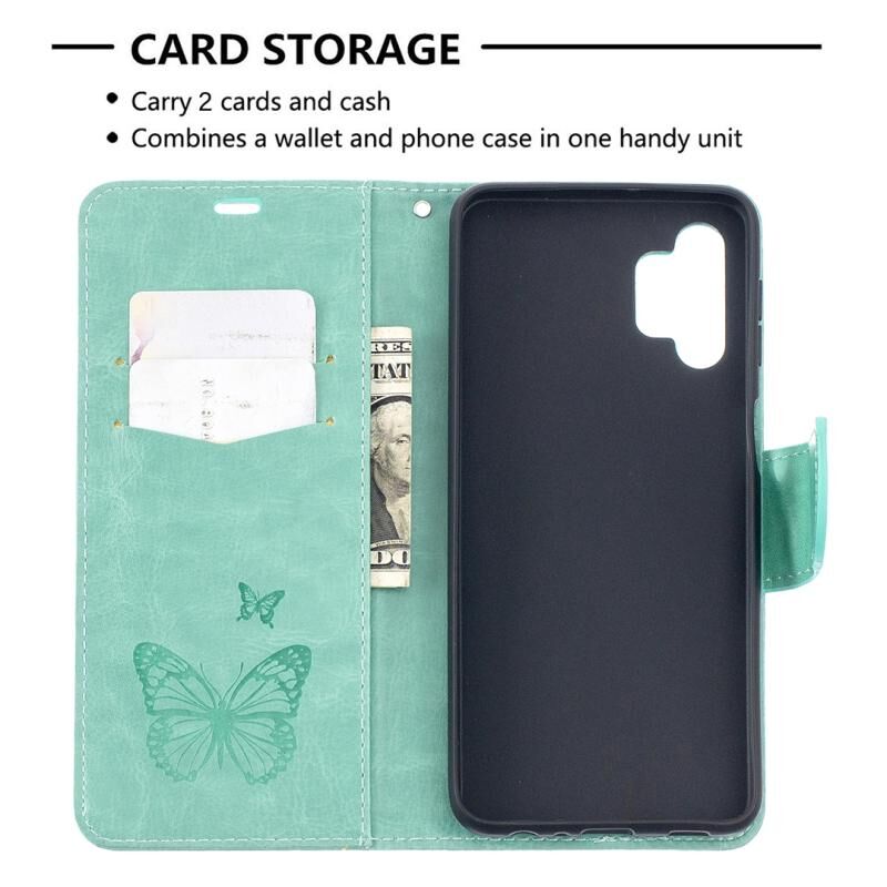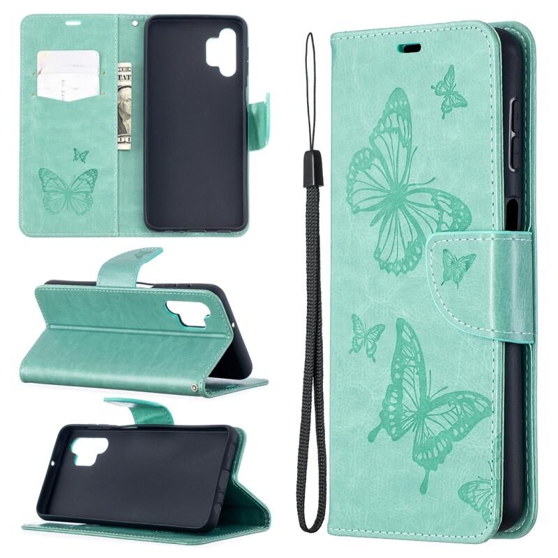 Θήκη Samsung Galaxy A32 5G με ανάγλυφο σχέδιο δύο πεταλούδων, οριζόντια, από δερματίνη PU με βάση στήριξης, θήκη για κάρτες, πορτοφόλι & λουρί (Πράσινο)