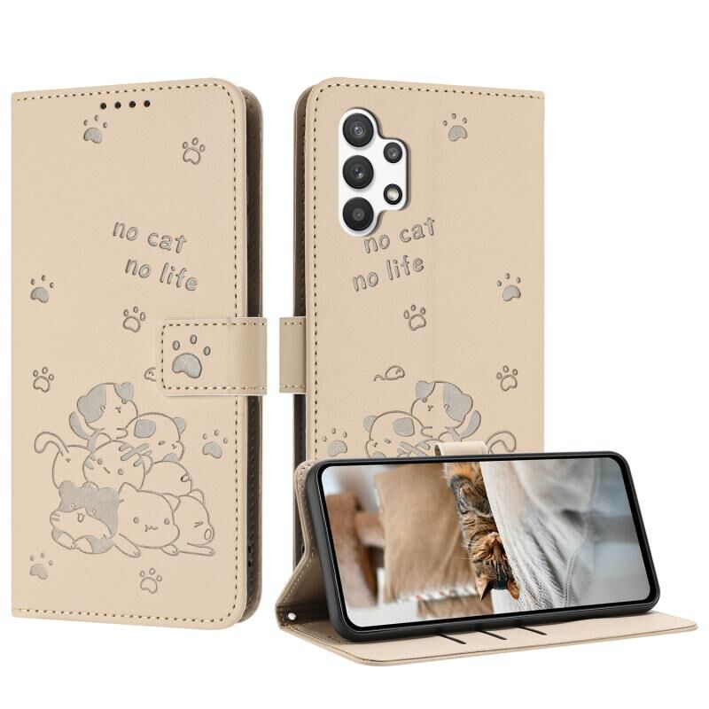 Θήκη δερμάτινη για Samsung Galaxy A32 5G / M32 5G με ανάγλυφο σχέδιο γατάκι και κορδόνι (Μπεζ)