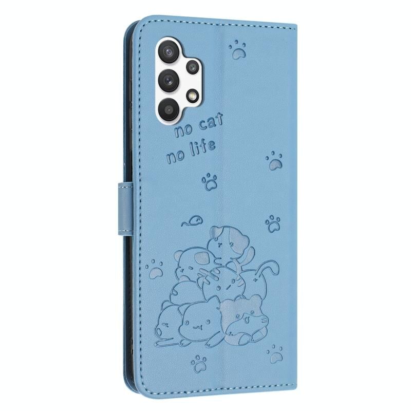 Θήκη δερμάτινη για Samsung Galaxy A32 5G / M32 5G με ανάγλυφο σχέδιο γατάκι και λουρί (Μωβ)