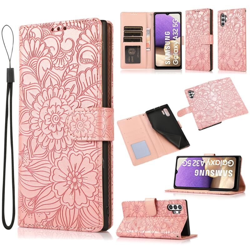 Για Samsung Galaxy A32 5G δέρμα αίσθηση ανάγλυφο ηλιοτρόπιο οριζόντια Flip δερμάτινη θήκη με υποδοχές για κάρτες & υποδοχές & πορτοφόλι & κορδόνι (Rose Gold)