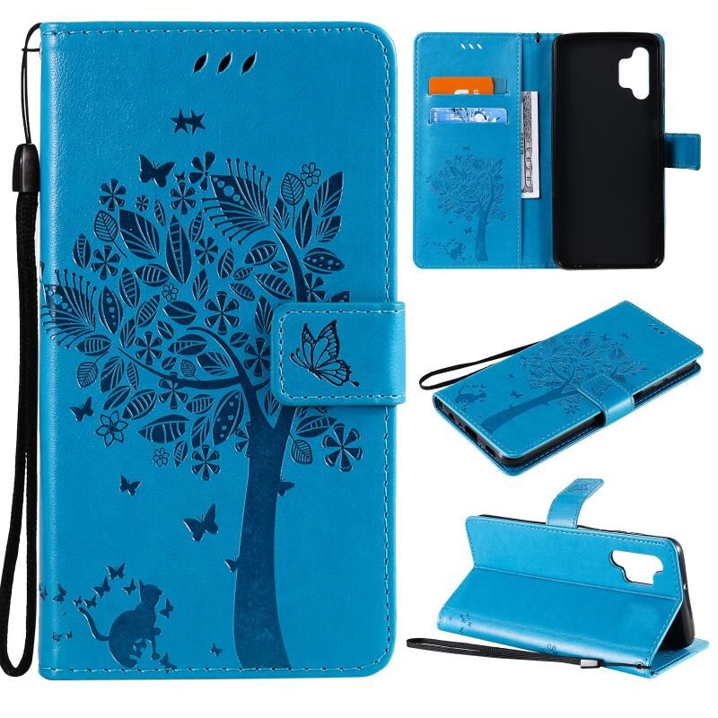 Για Samsung Galaxy A32 5G Δέντρο & Γάτα μοτίβο πιεστική εκτύπωση οριζόντια Flip PU δέρμα υπόθεση με θήκη & υποδοχές για κάρτες & πορτοφόλι & κορδόνι (μπλε) (Μπλε)