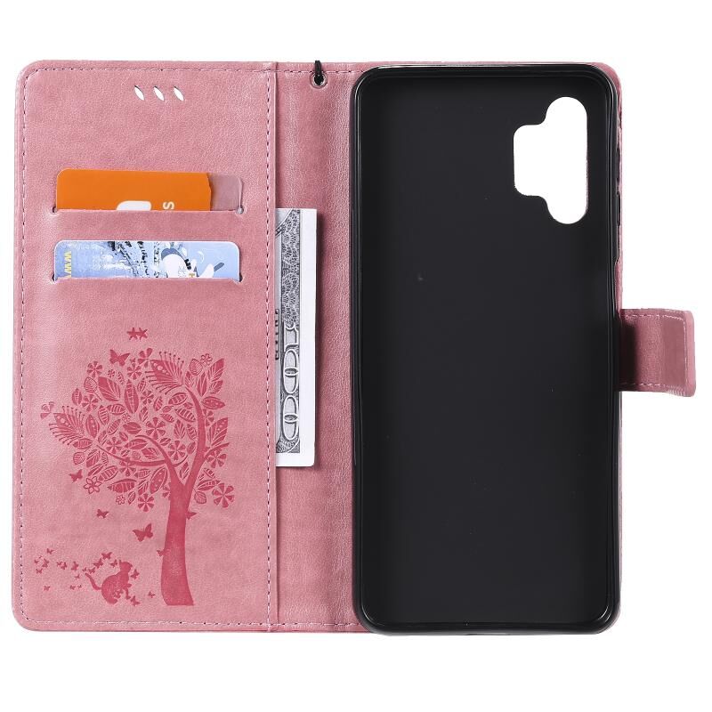 Για Samsung Galaxy A32 5G Δέντρο & Γάτα μοτίβο πιεστική εκτύπωση οριζόντια Flip PU δέρμα υπόθεση με θήκη & υποδοχές για κάρτες & πορτοφόλι & κορδόνι (ροζ) (ρόζ)