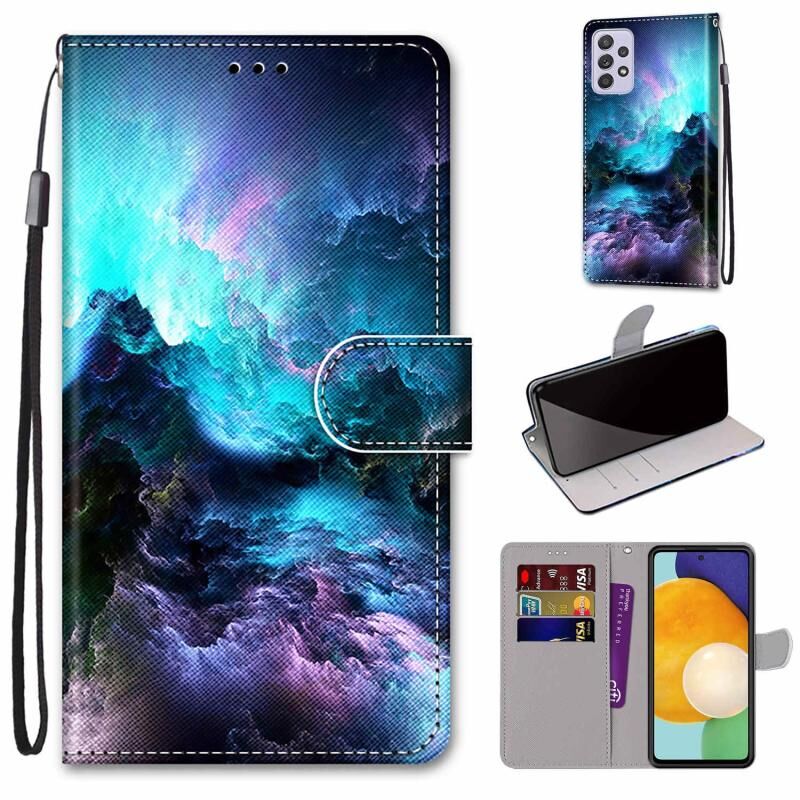 Θήκη τηλεφώνου Samsung Galaxy A33 5G από δέρμα με οριζόντιο άνοιγμα, πολύχρωμο σχέδιο, ανάγλυφη υφή, με βάση στήριξης, θήκες για κάρτες, πορτοφόλι και κορδόνι (Πολύχρωμα Σύννεφα)