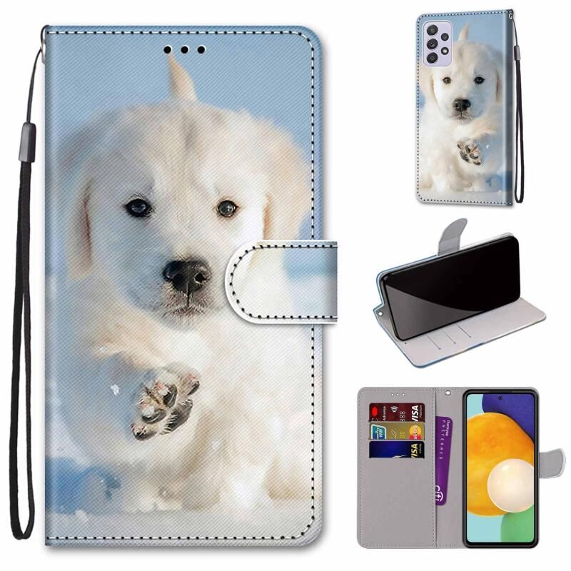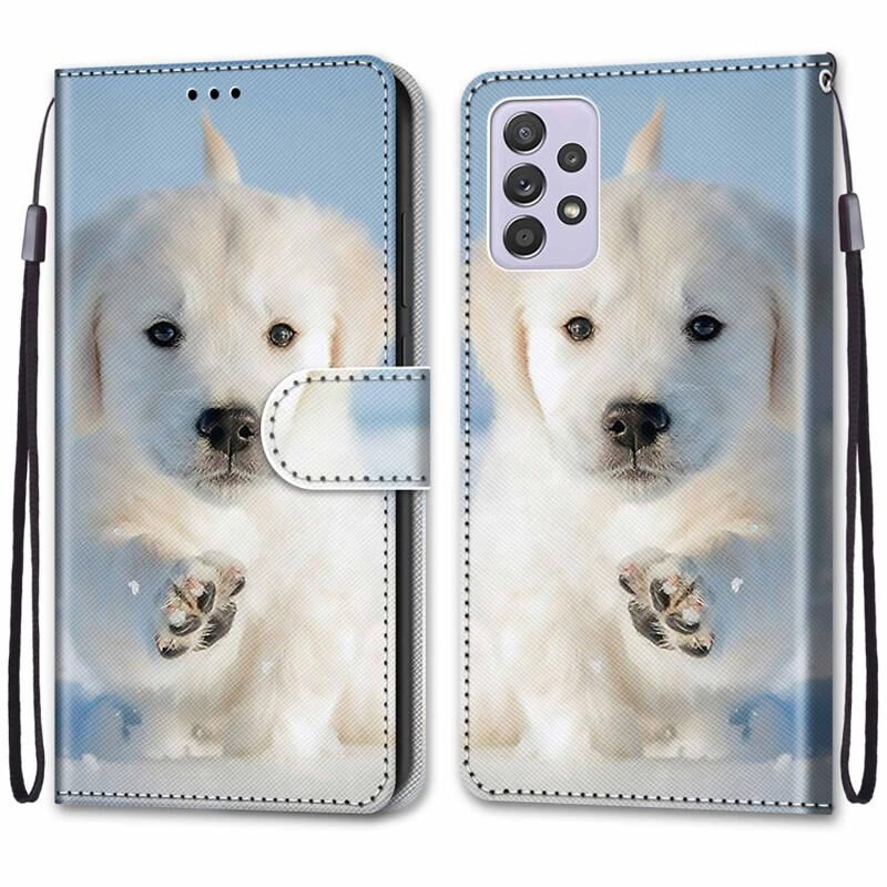 Θήκη τηλεφώνου Samsung Galaxy A33 5G από δέρμα με οριζόντιο άνοιγμα, πολύχρωμο σχέδιο, ανάγλυφη υφή, με βάση στήριξης, θήκες για κάρτες, πορτοφόλι και κορδόνι (Snow Puppy)