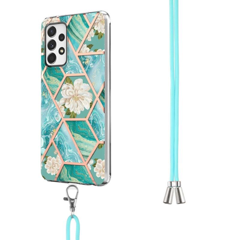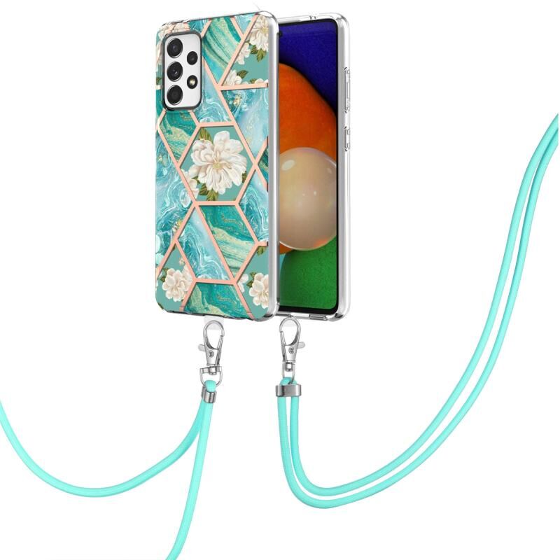 Θήκη κινητού τηλεφώνου TPU με σχέδιο μαρμάρου και λουλουδιών patchwork για Samsung Galaxy A33 5G με κορδόνι (Ροζ Λουλούδι)