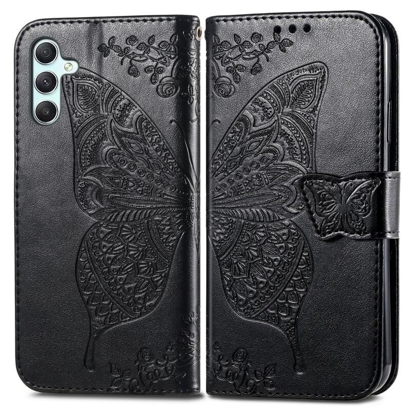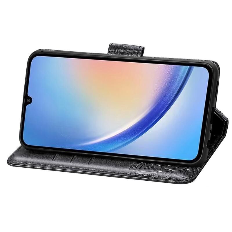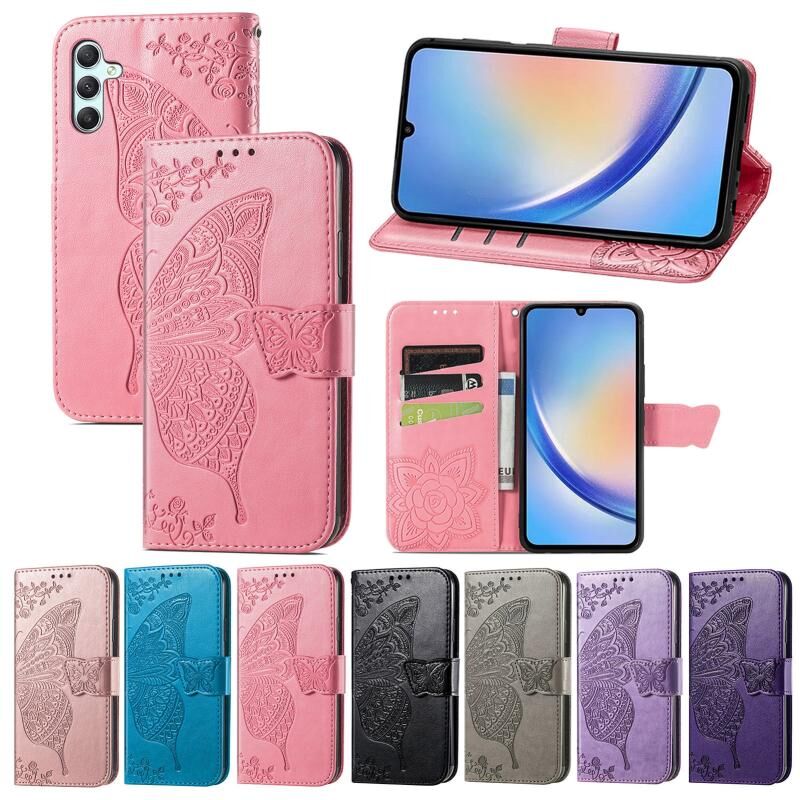 Θήκη τηλεφώνου Samsung Galaxy A34 5G από δέρμα με ανάγλυφο σχέδιο πεταλούδας και λουλουδιών (Χρυσό ροζ)