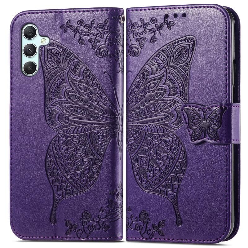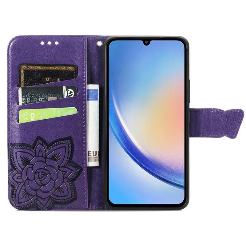 Θήκη τηλεφώνου Samsung Galaxy A34 5G από δέρμα με ανάγλυφο σχέδιο πεταλούδας και λουλουδιών (Χρυσό ροζ)