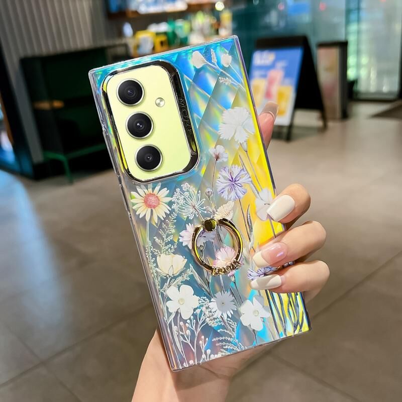 Θήκη τηλεφώνου TPU με δακτύλιο στήριξης και λουλουδάτο σχέδιο με ηλεκτρολυτική επίστρωση λέιζερ για Samsung Galaxy A34 5G (Χρυσάνθεμο AH5)