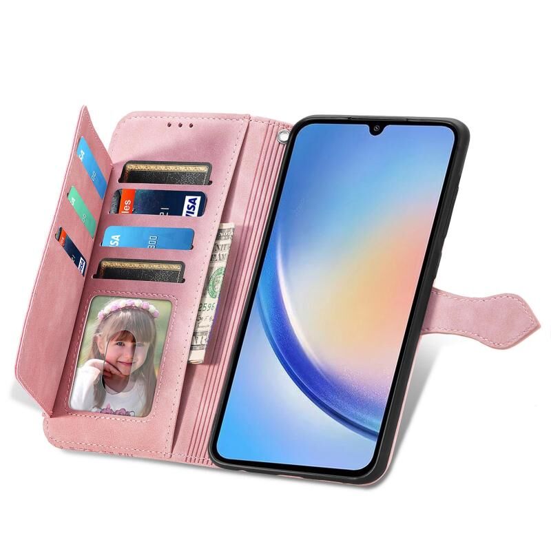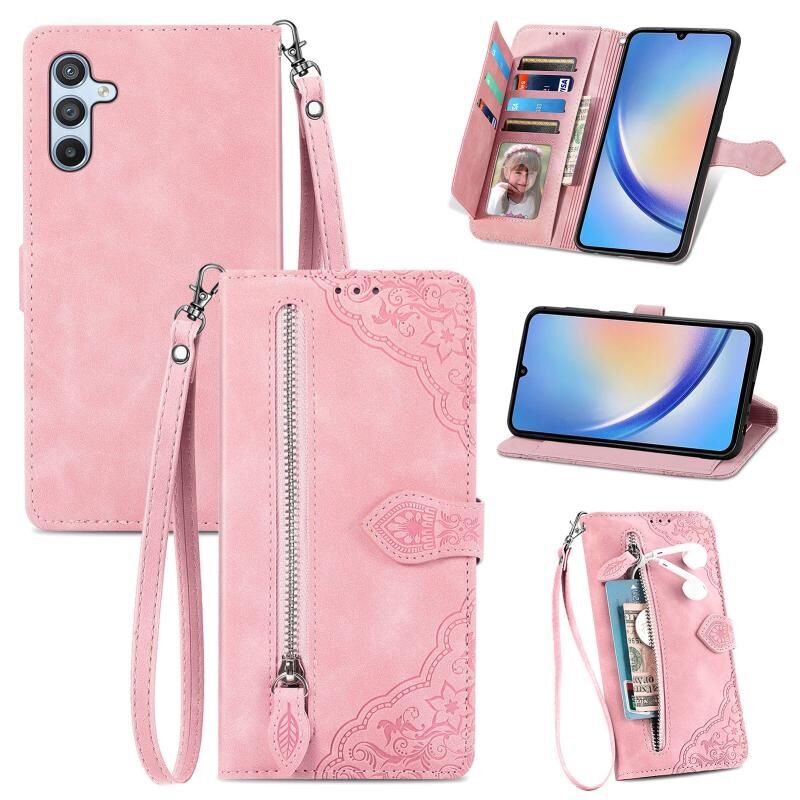 Για Samsung Galaxy A34 5G ανάγλυφο λουλούδι φερμουάρ δερμάτινη θήκη τηλεφώνου (ροζ χρυσό)