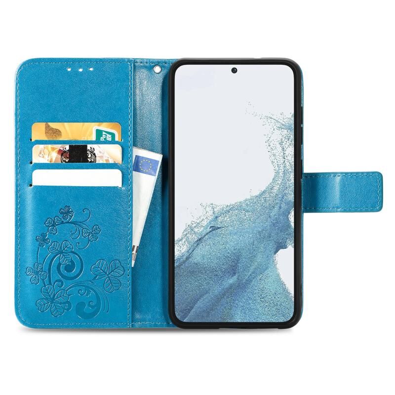 Για Samsung Galaxy A34 5G Four-leaf κούμπωμα ανάγλυφο πόρπη δερμάτινη θήκη τηλεφώνου (μπλε)