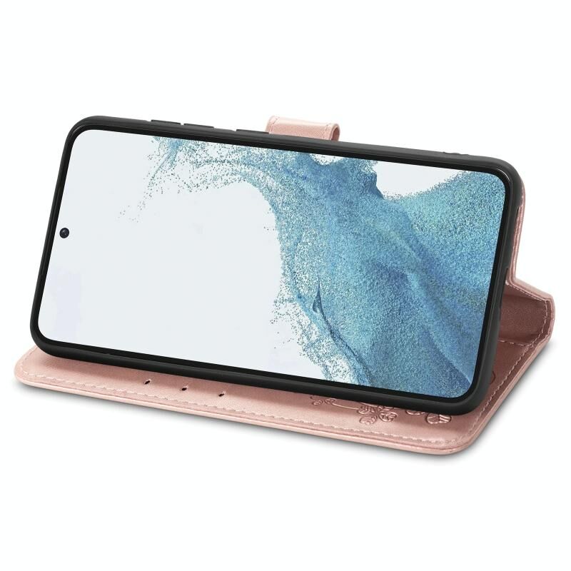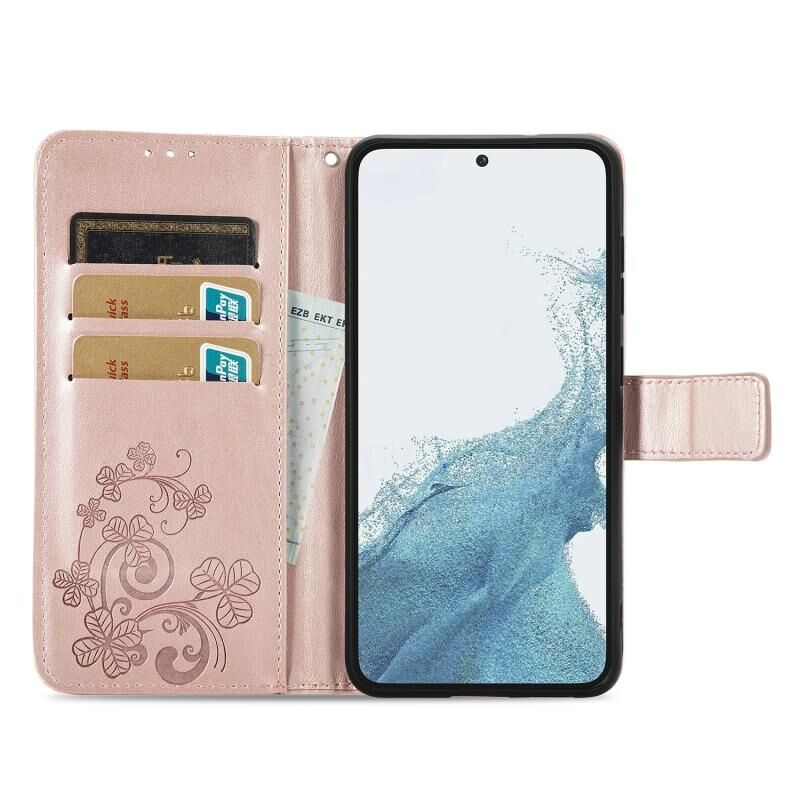 Για Samsung Galaxy A34 5G Four-leaf κούμπωμα ανάγλυφο πόρπη δερμάτινη θήκη τηλεφώνου (Rose Gold)