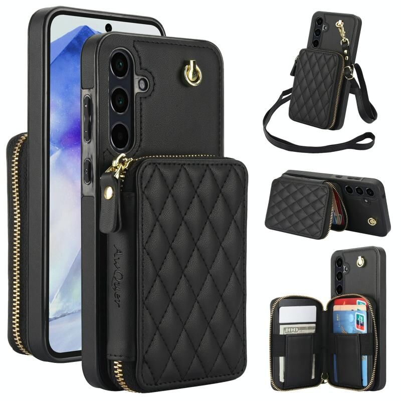 Θήκη κινητού τηλεφώνου Samsung Galaxy A35 5G AwQuer Crossbody με φερμουάρ, πορτοφόλι από δέρμα με ρόμβους (Μαύρο) (Awquer)