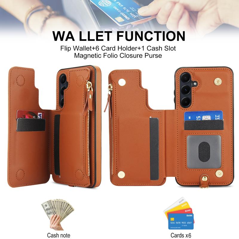 For Samsung Galaxy A35 5G Double Flap Zipper RFID Leather Phone Case with Short Lanyard(Brown)