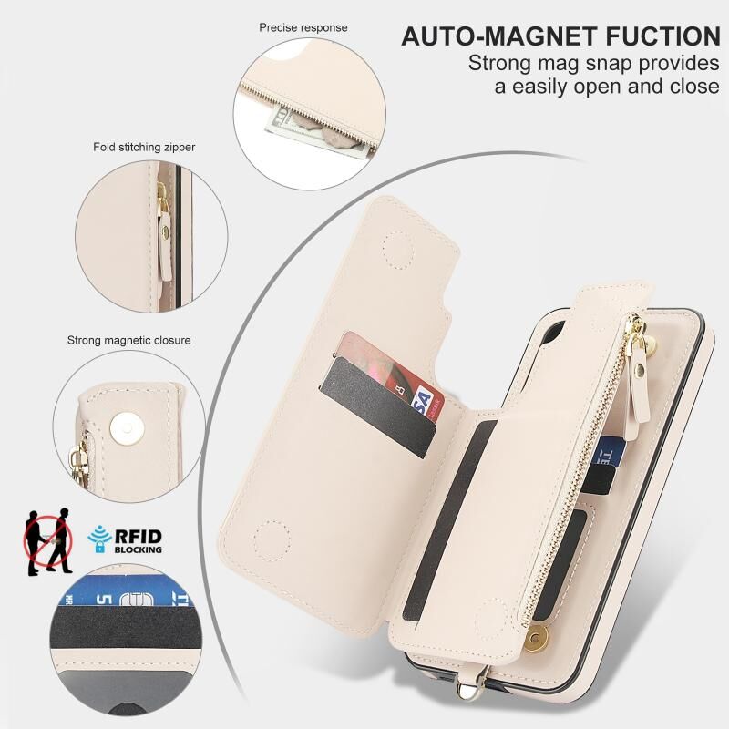 Θήκη τηλεφώνου Samsung Galaxy A35 5G από δέρμα με διπλό φερμουάρ και RFID, με κοντό κορδόνι (Λευκό)