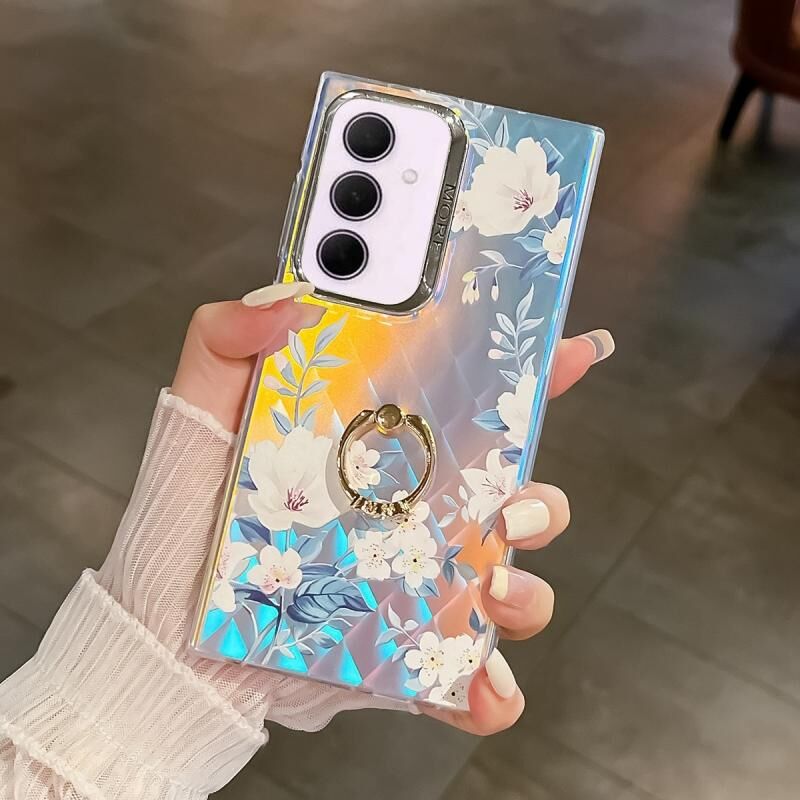 Θήκη κινητού τηλεφώνου Samsung Galaxy A35 5G από TPU με δακτύλιο στήριξης και σχέδιο λουλουδιών με ηλεκτρολυτική επίστρωση λέιζερ (Λευκό Λουλούδι AH10)