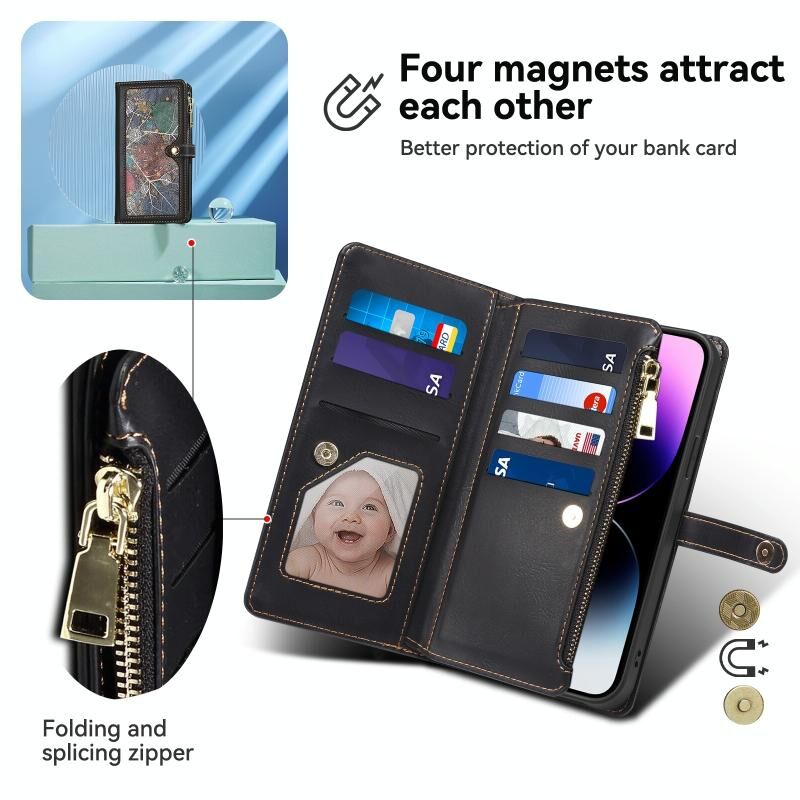 4. Πορτοφόλι με φερμουάρ: Η σούπερ υποδοχή πολλαπλών καρτών μπορεί να χωρέσει πολλαπλές κάρτες. το άνοιγμα και το κλείσιμο της θήκης μετρητών με φερμουάρ μπορεί να προστατεύσει τα μετρητά σας. Άνετο και πρακτικό για να βγείτε έξω μια τσάντα κινητού τηλεφώνου αρκετά.