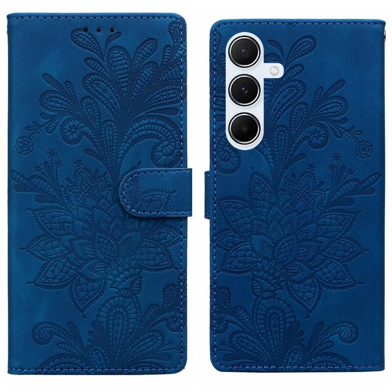 Θήκη κινητού τηλεφώνου Samsung Galaxy A35 5G από PU με δαντελένιο λουλουδάτο ανάγλυφο και μαγνητικό κούμπωμα, με λουρί καρπού (Μπλε)