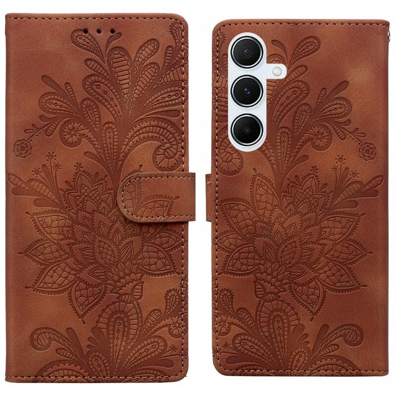 Θήκη κινητού τηλεφώνου Samsung Galaxy A35 5G από PU με δαντελένιο λουλουδάτο ανάγλυφο και μαγνητικό κούμπωμα, με λουρί καρπού (Καφέ)