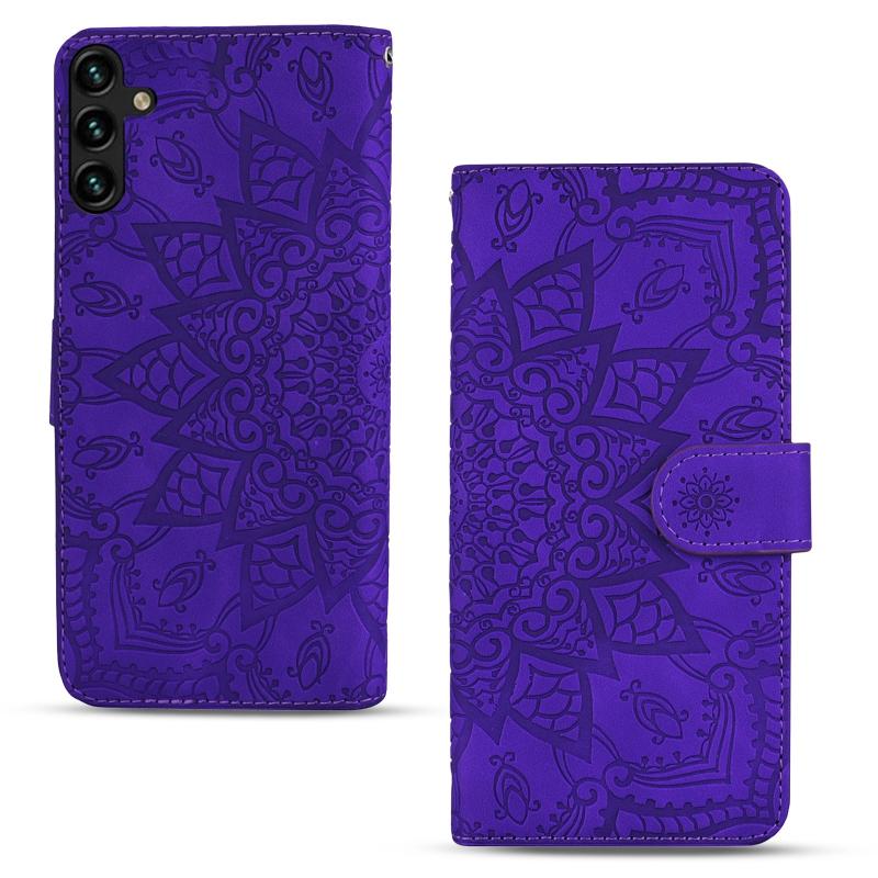 For Samsung Galaxy A35 5G Mandala Embossed Dual-Fold Calf Leather Phone Case(Purple)