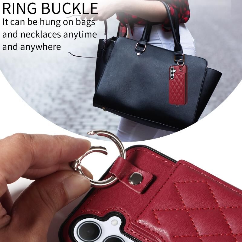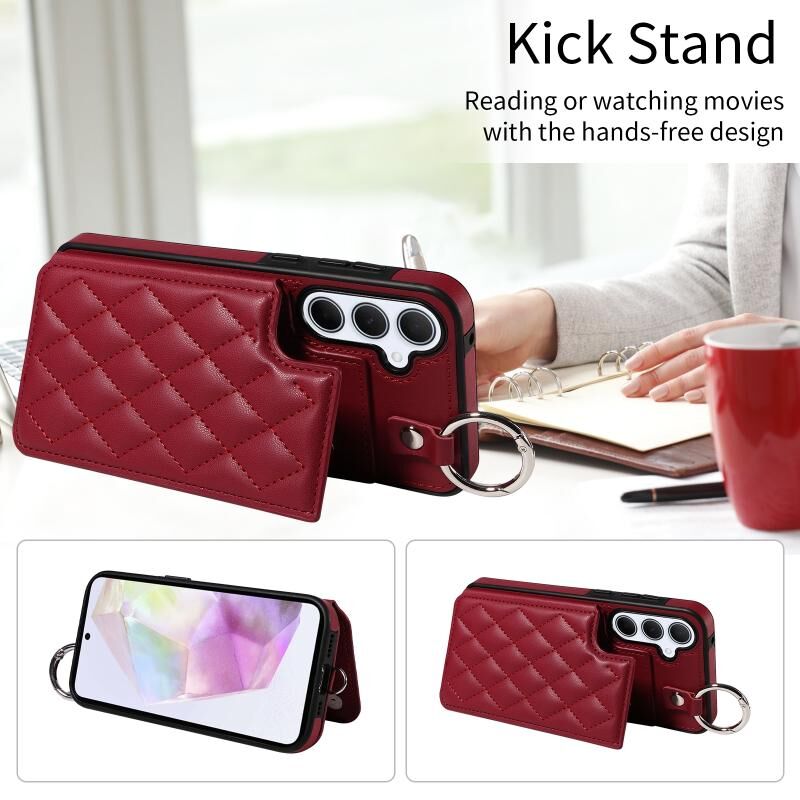 Για Samsung Galaxy A35 5G Rhombic υφή κάρτα τσάντα υπόθεση τηλεφώνου με σύντομο κορδόνι (κόκκινο κρασί)