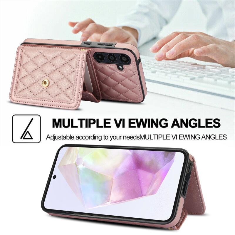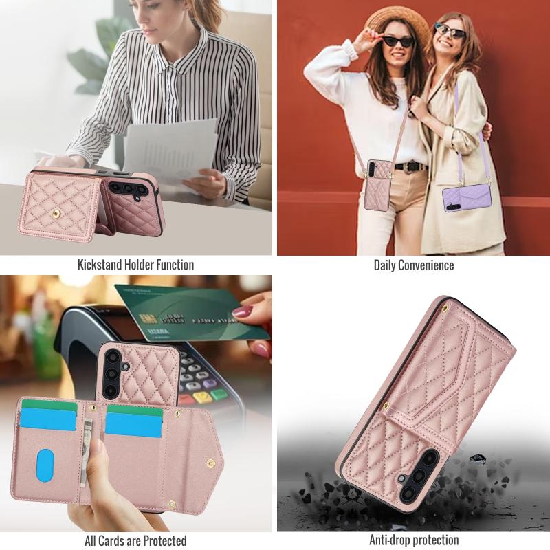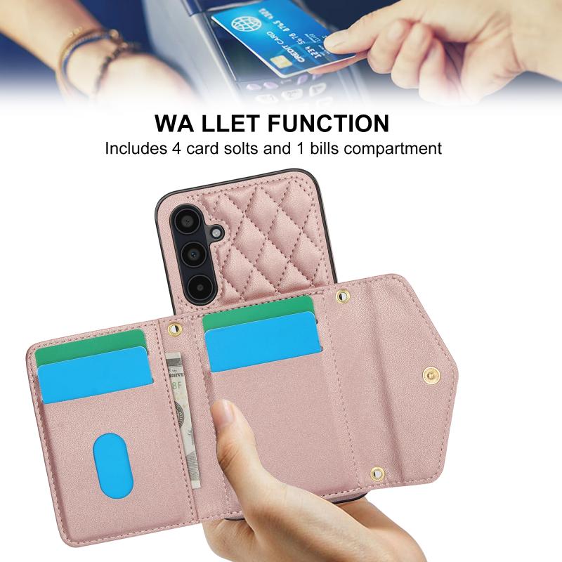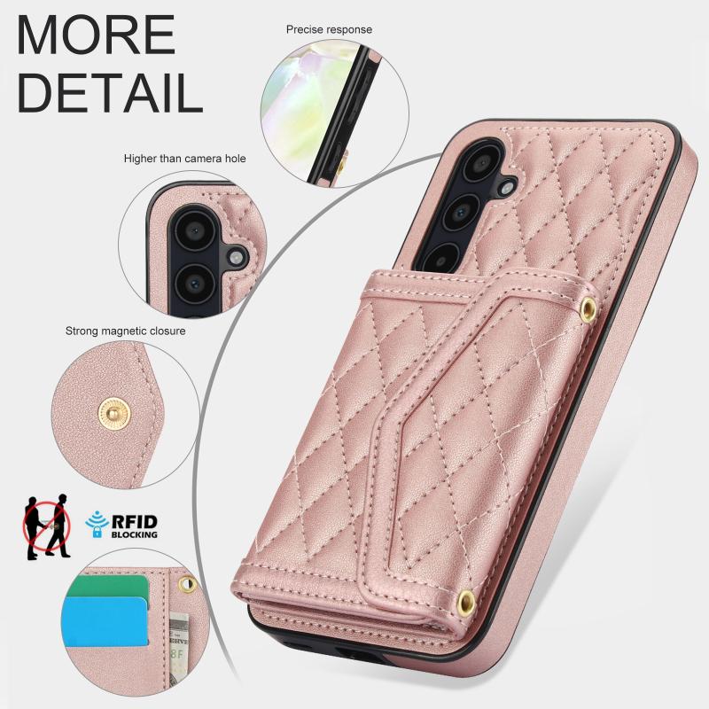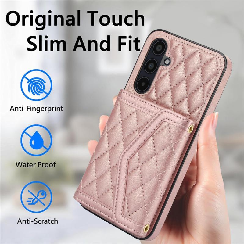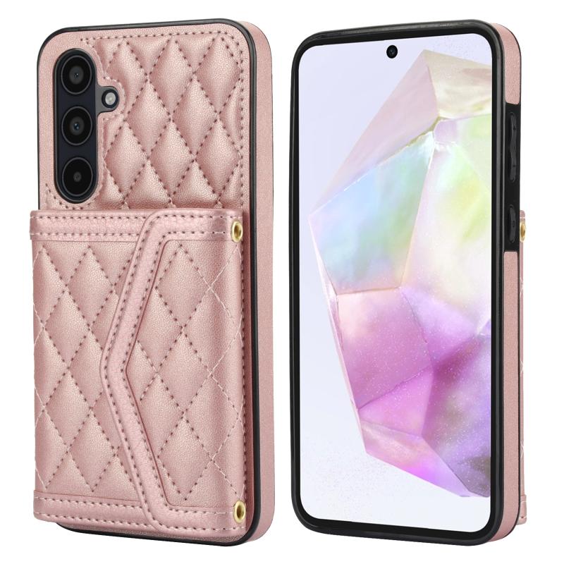 For Samsung Galaxy A35 5G Splicing Rhombic Texture Card Bag Phone Case with Long Lanyard(Rose Gold)