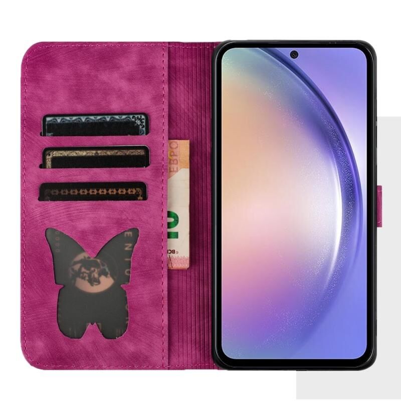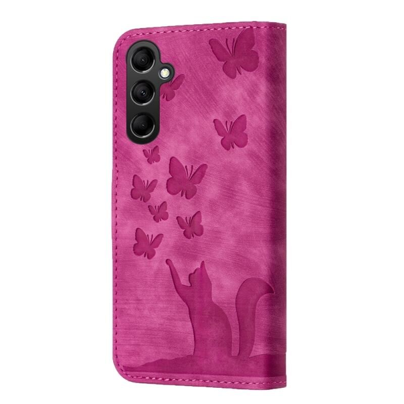 Θήκη τηλεφώνου Samsung Galaxy A35 με ανάγλυφο σχέδιο πεταλούδας και γάτας, δερμάτινη, τύπου flip (ρόζ)