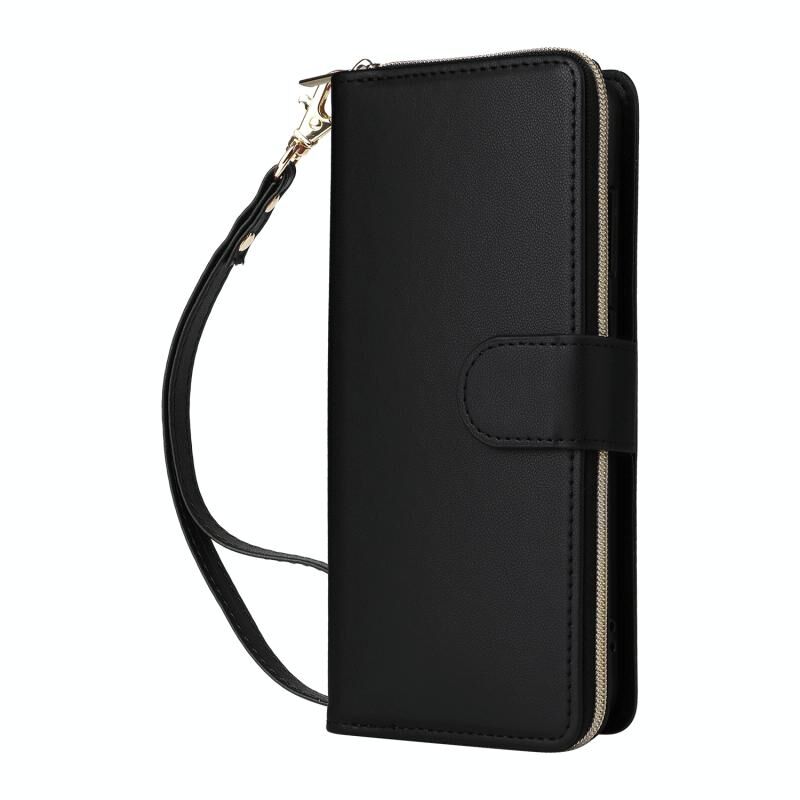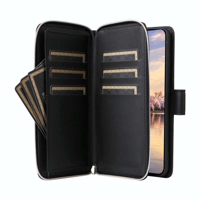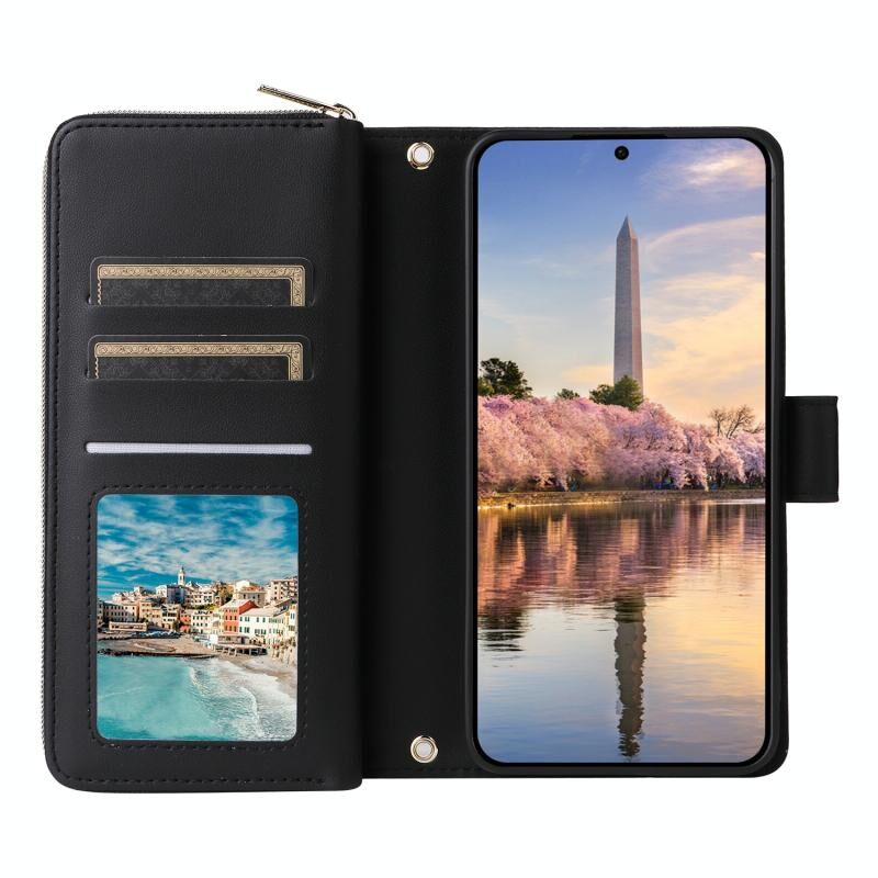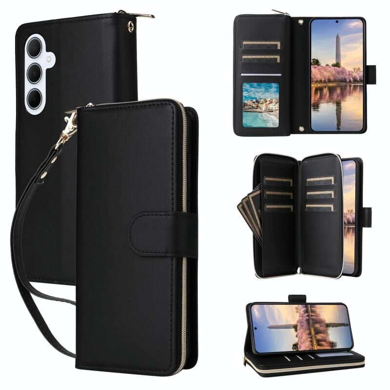Για Samsung Galaxy A35 εννέα-κάρτα Slots φερμουάρ πορτοφόλι τσάντα δέρμα υπόθεση τηλεφώνου (Μαύρο)
