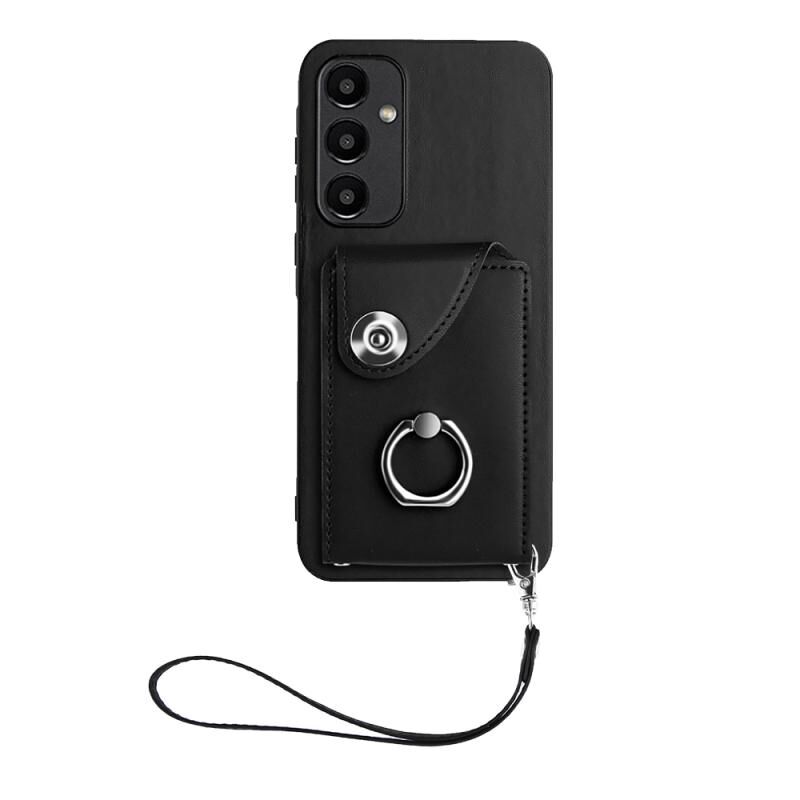 Για Samsung Galaxy A35 Οργανική κάρτα τσάντα τσάντα δαχτυλίδι κάτοχος PU θήκη τηλεφώνου με κορδόνι (Μαύρο)
