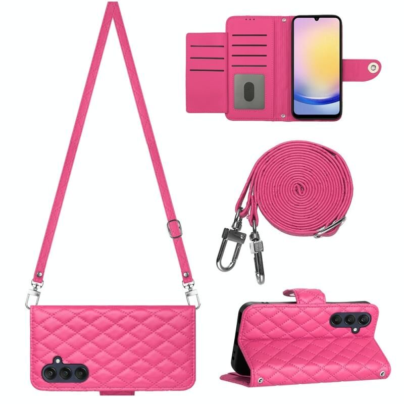 Για Samsung Galaxy A35 Ρομβική υφή Flip δερμάτινη θήκη τηλεφώνου με μακρύ κορδόνι (Ροζέ κόκκινο)