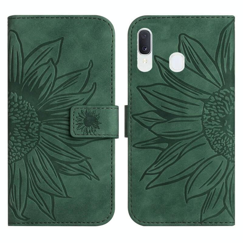 Για το Samsung Galaxy A40 δέρμα αίσθηση Sun Flower μοτίβο Flip δέρμα τηλέφωνο υπόθεση με κορδόνι (πράσινο)