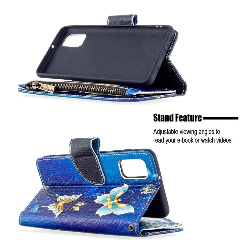 Θήκη Samsung Galaxy A41 Δερμάτινη Οριζόντια με Φερμουάρ, Πολύχρωμο Σχέδιο Ζωγραφικής, με Θήκη & Θήκες Καρτών & Πορτοφόλι (Μωβ Πεταλούδα)