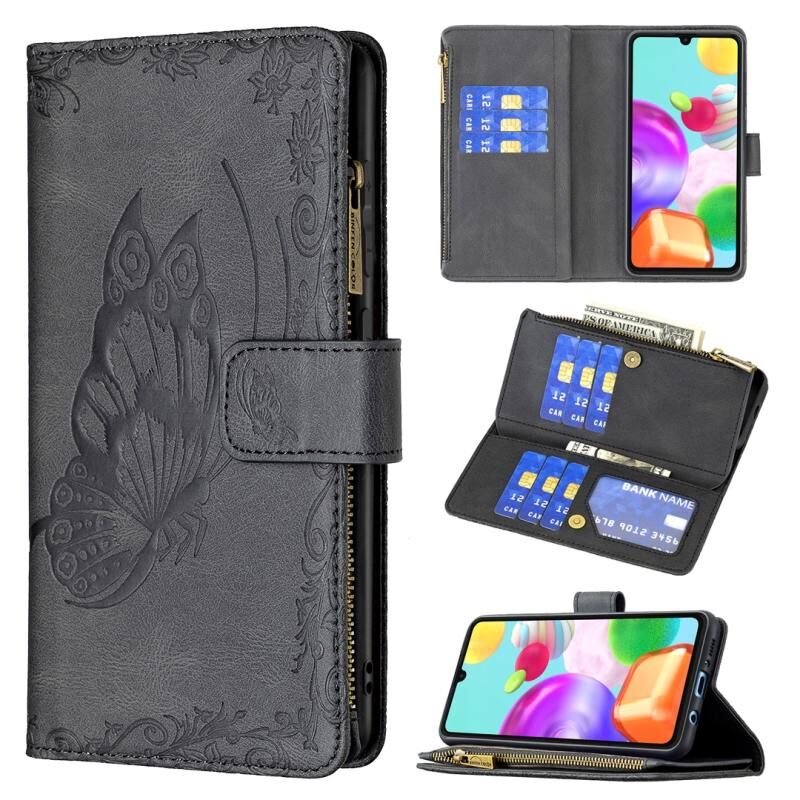 Για Samsung Galaxy A41 Flying πεταλούδα ανάγλυφο μοτίβο φερμουάρ οριζόντια Flip δερμάτινη θήκη με κάτοχο & υποδοχές για κάρτες & πορτοφόλι (Μαύρο)