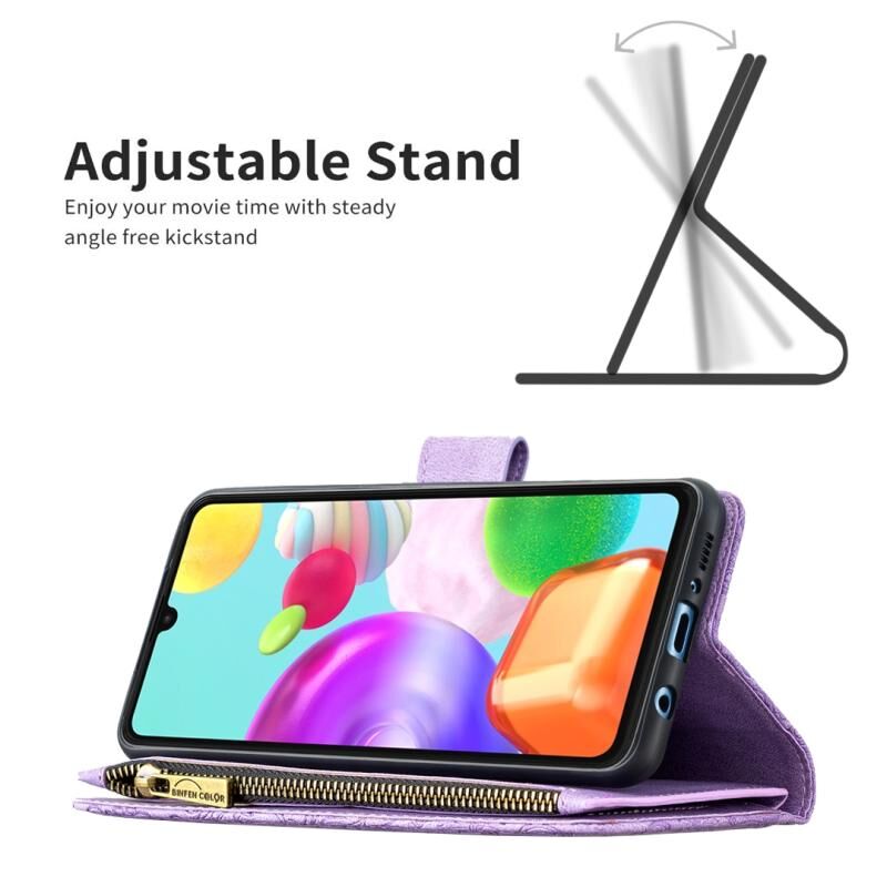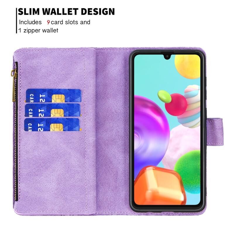 Για Samsung Galaxy A41 Flying πεταλούδα ανάγλυφο μοτίβο φερμουάρ οριζόντια Flip δερμάτινη θήκη με κάτοχο & υποδοχές για κάρτες & πορτοφόλι (Μωβ)