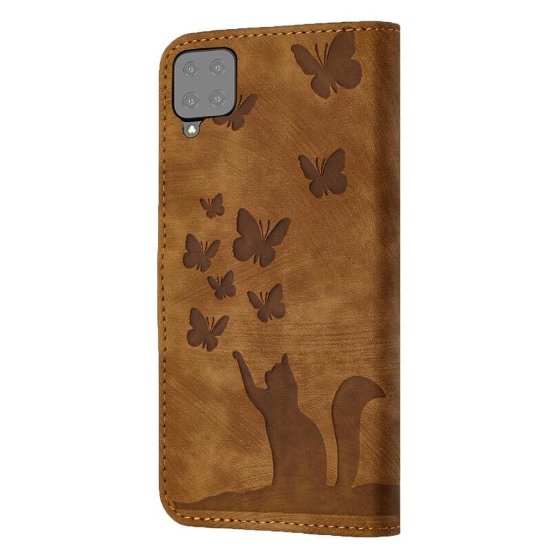 Θήκη τηλεφώνου Samsung Galaxy A42 5G, δερμάτινη, τύπου flip, με ανάγλυφο σχέδιο πεταλούδας και γάτας (Μωβ)