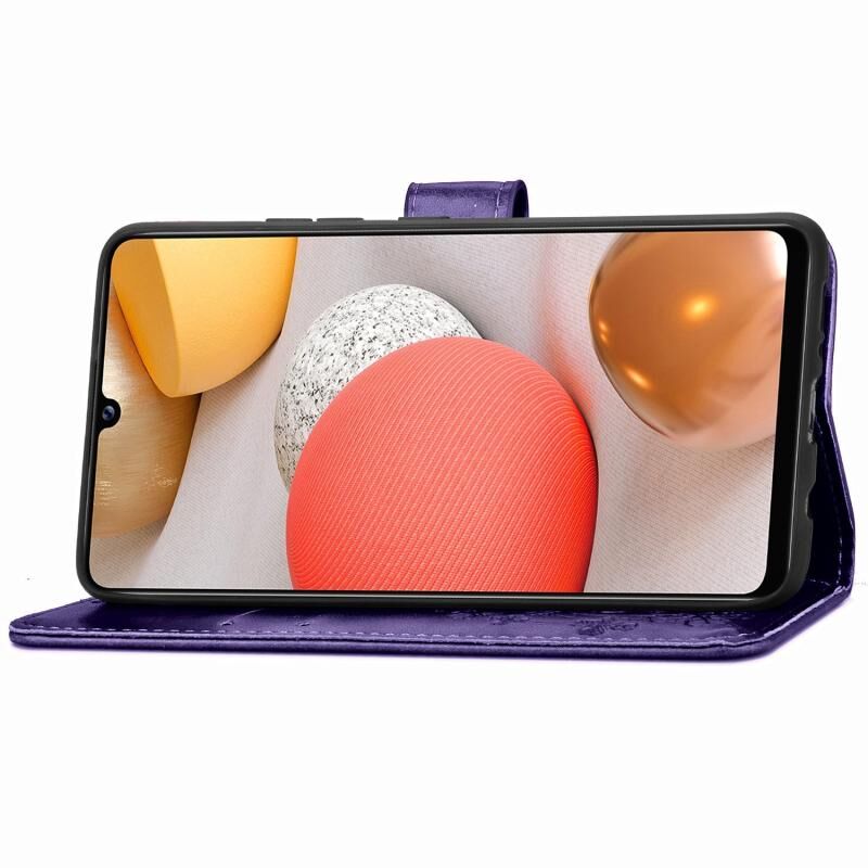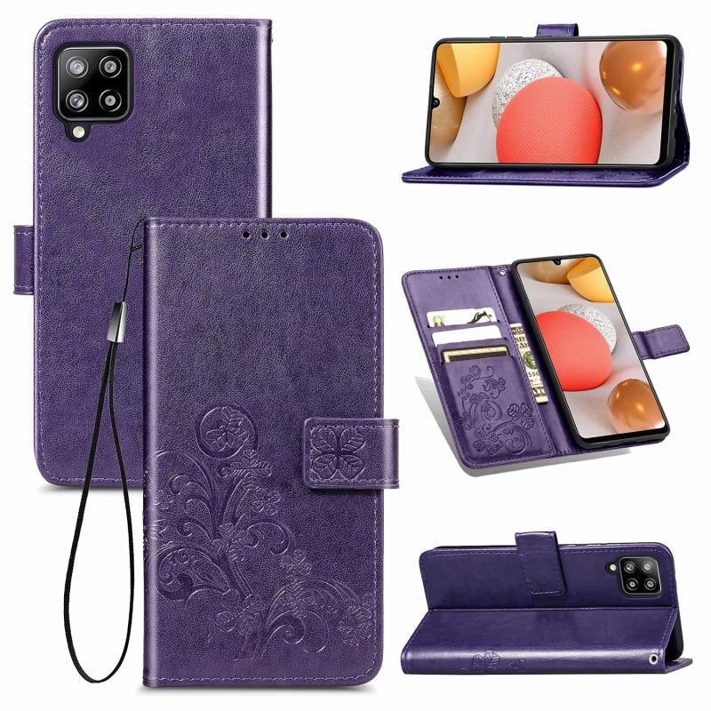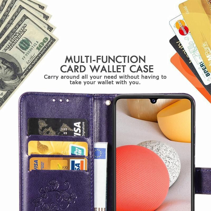 Θήκη δερμάτινη προστασίας κινητού τηλεφώνου για Samsung Galaxy A42 5G με σχέδιο τριφυλλιού, ανάγλυφη αγκράφα, λουρί, θήκη για κάρτες, πορτοφόλι και λειτουργία βάσης (Κόκκινο Ρόδι)