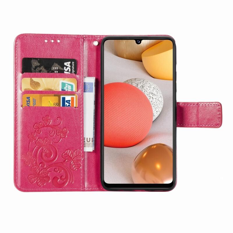 Θήκη δερμάτινη προστασίας κινητού τηλεφώνου για Samsung Galaxy A42 5G με σχέδιο τριφυλλιού, ανάγλυφη αγκράφα, λουρί, θήκη για κάρτες, πορτοφόλι και λειτουργία βάσης (Κόκκινο Ρόδι)