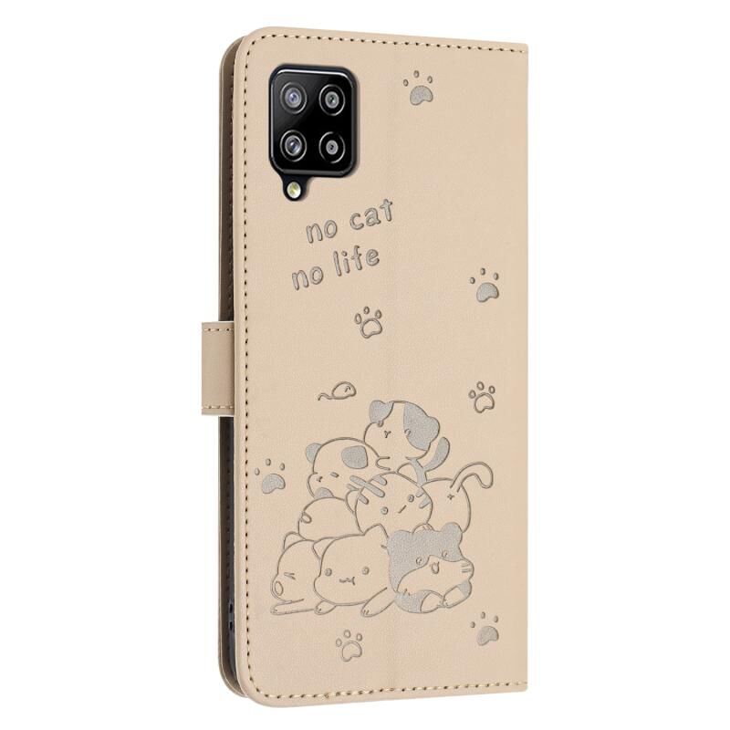 Θήκη δερμάτινη για Samsung Galaxy A42 5G / M42 5G με ανάγλυφο σχέδιο γατάκι και κορδόνι (Μπεζ)