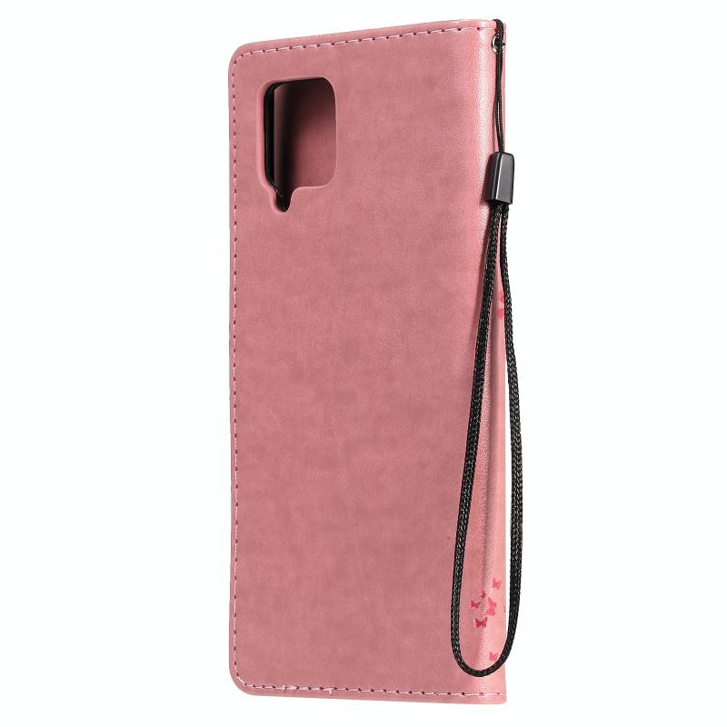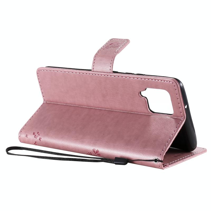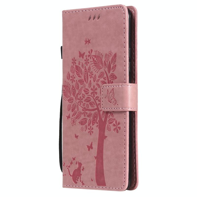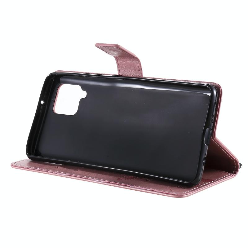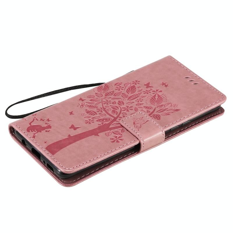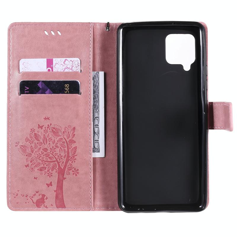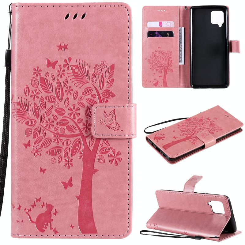 For Samsung Galaxy A42 5G Tree & Cat Pattern Pressed Printing Horizontal Flip PU Leather Case with Holder & Card Slots & Wallet & Lanyard(Pink)
