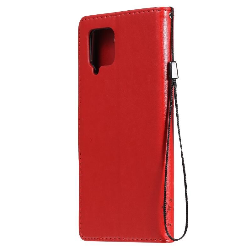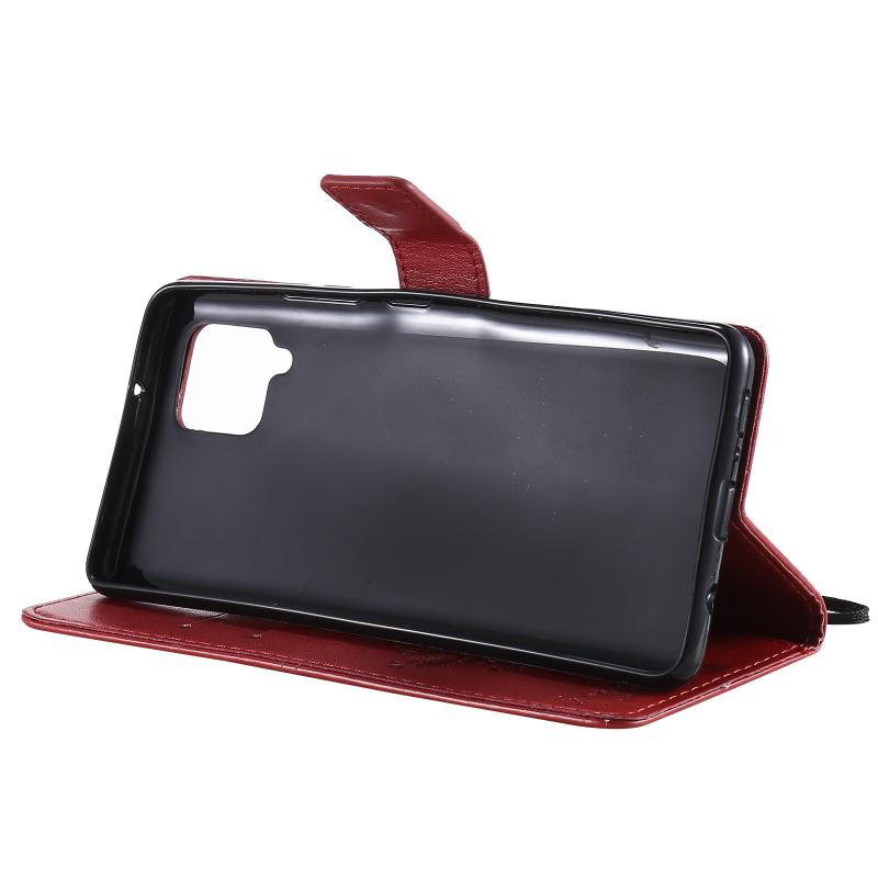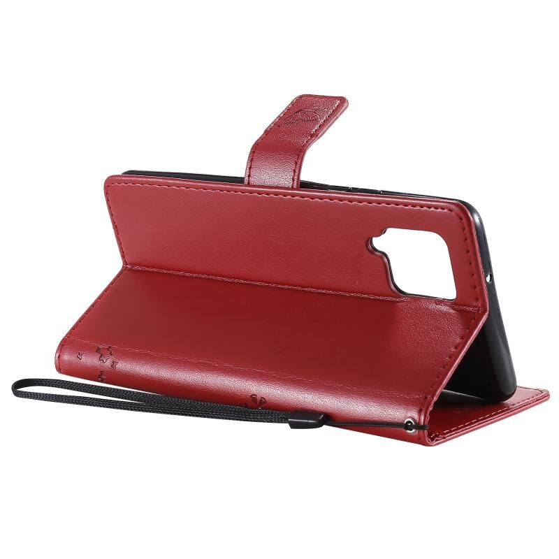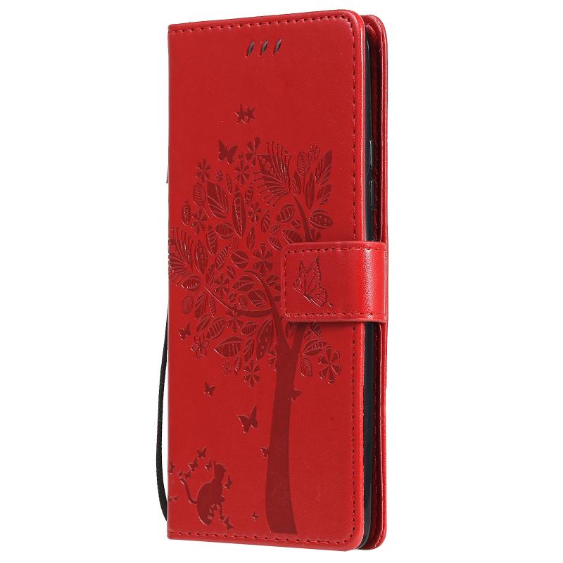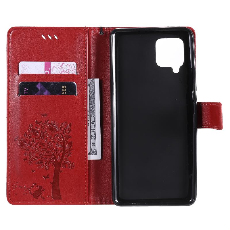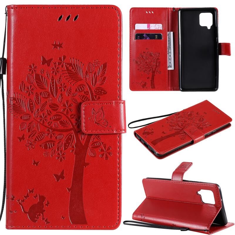 For Samsung Galaxy A42 5G Tree & Cat Pattern Pressed Printing Horizontal Flip PU Leather Case with Holder & Card Slots & Wallet & Lanyard(Red)