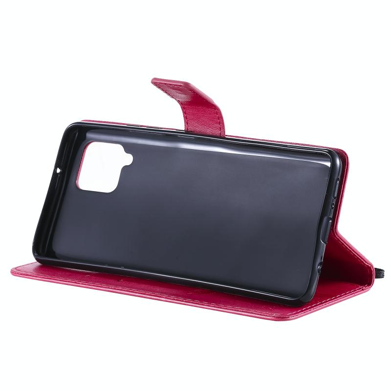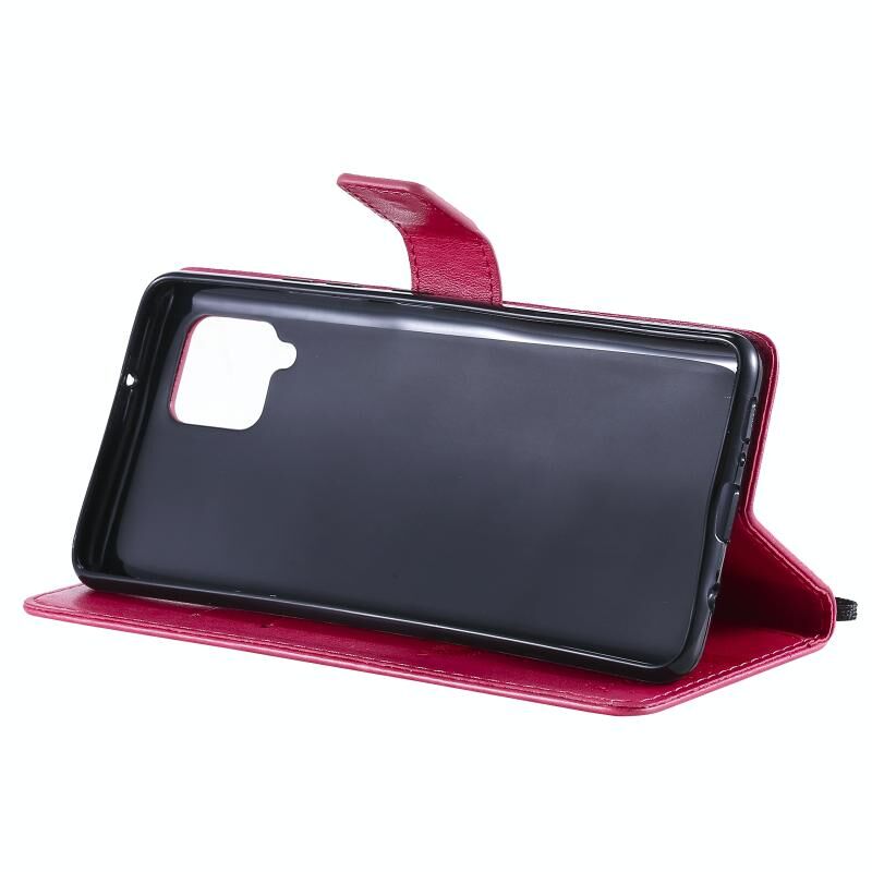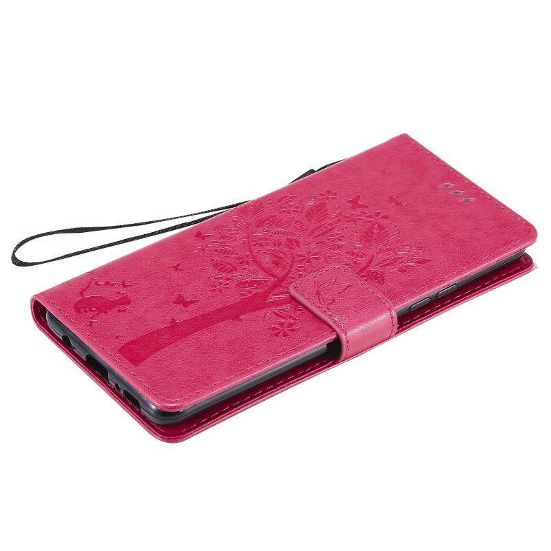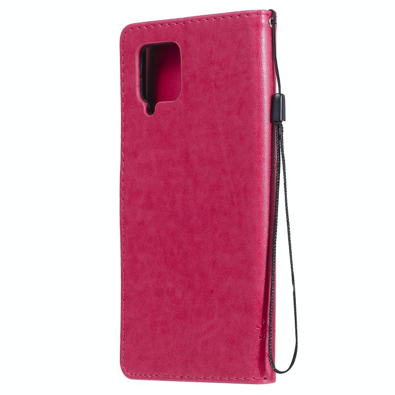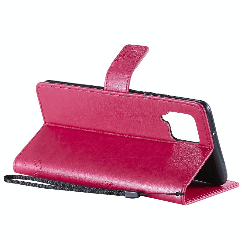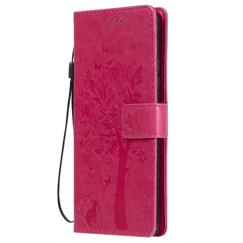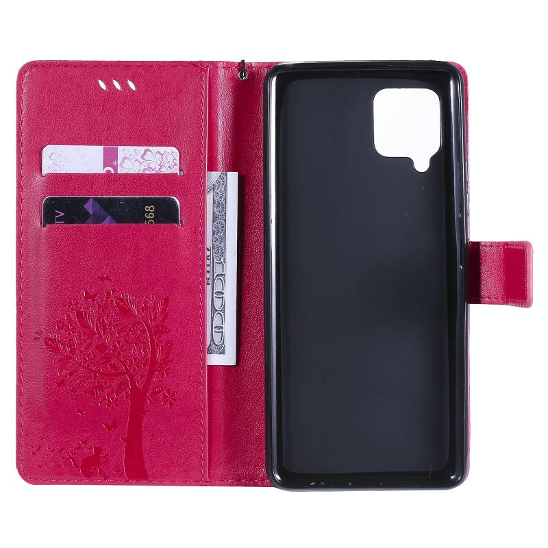 For Samsung Galaxy A42 5G Tree & Cat Pattern Pressed Printing Horizontal Flip PU Leather Case with Holder & Card Slots & Wallet & Lanyard(Rose Red)