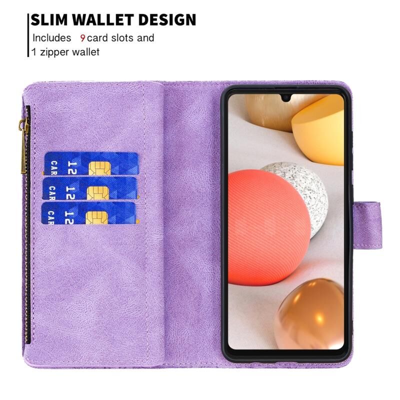 Για Samsung Galaxy A42 Flying πεταλούδα ανάγλυφο μοτίβο φερμουάρ οριζόντια Flip δερμάτινη θήκη με κάτοχο & υποδοχές για κάρτες & πορτοφόλι (μωβ)