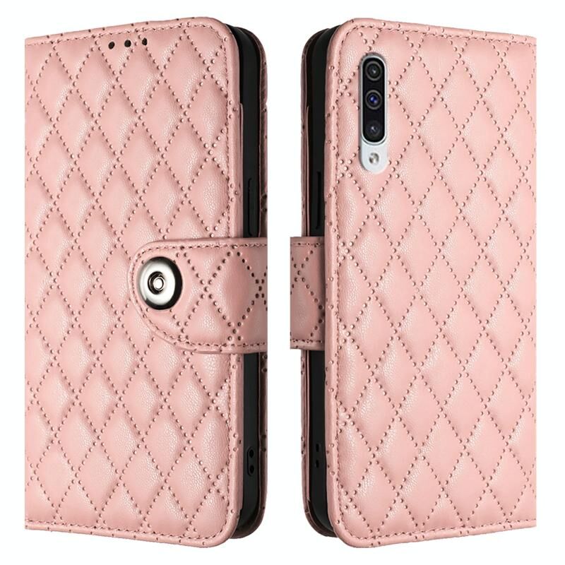 Για Samsung Galaxy A50 / A30s / A50s Ρομβική υφή Flip δερμάτινη θήκη τηλεφώνου με κορδόνι (Κοραλλί ροζ)