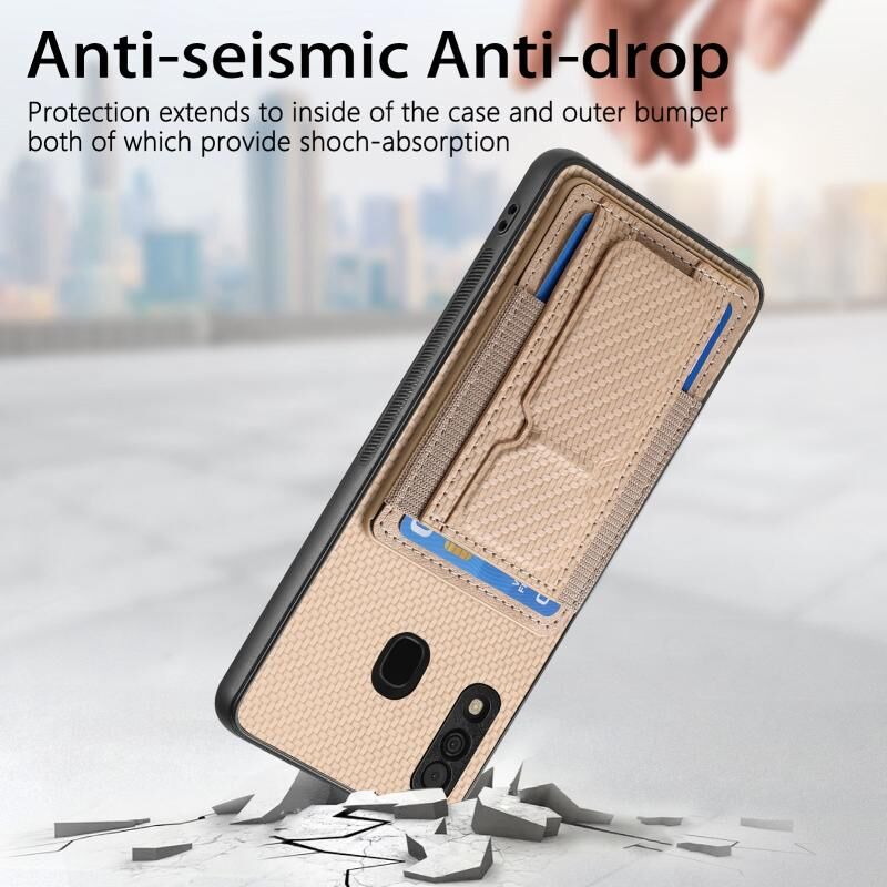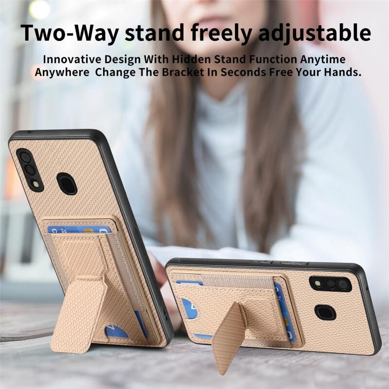 For Samsung Galaxy A50/A50s/A30s Carbon Fiber Fold Stand Elastic Card Bag Phone Case(Khaki)