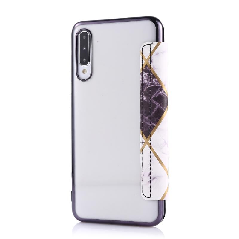 Θήκη δέρματος οριζόντιας αναδίπλωσης PU + TPU με επιμετάλλωση μπρούντζου για Samsung Galaxy A50 με βάση & υποδοχή κάρτας (Μαύρο)